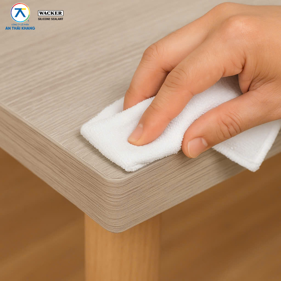 Bước 1: Làm sạch mép bàn. Đảm bảo bề mặt khô, sạch bụi và không có dầu mỡ.