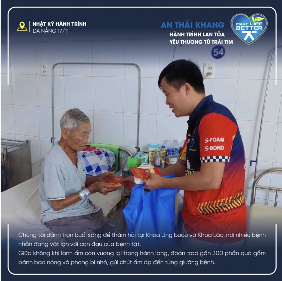 Điểm nhấn xúc động nhất trong hành trình lan tỏa yêu thương tại Đà Nẵng chính là buổi thăm và tặng quà tại Bệnh viện Ung bướu. Gần 300 phần quà - gần 300 nụ cười ngày 16/11.