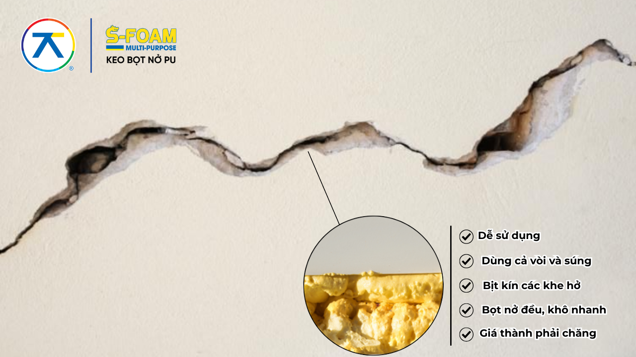 Keo Bọt Nở S-FOAM là bọt polyurethane một thành phần đa năng, được thiết kế đặc biệt để lấp đầy khe hở, bịt kín mối nối và tạo lớp cách nhiệt, cách âm hiệu quả.